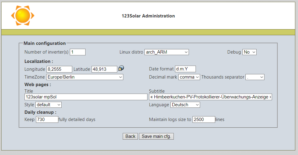 Jetzt in im browser die Seitehttp://<IP-Adresse des PI>/123solar/admin/admin.php aufrufen und die Konfiguration von 123solar fertigstellen.