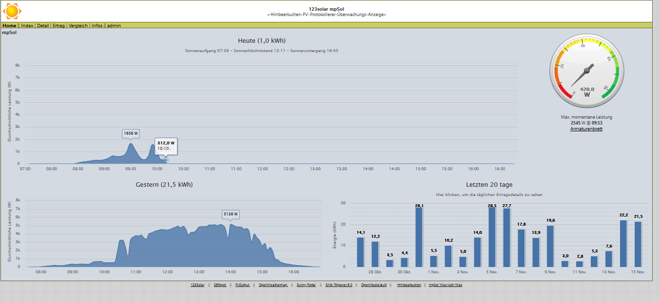 Sobald 123Solar aktiviert ist werden die aktuellen Daten (seit Aktivierung 123solar) aus der SBFspot-DB gelesen und im Ordner /etc/www/123solar\data\invt1\ als csv-Datei abgelegt und entsprechend visualisiert. Werte die vor dem Zeitpunkt der Aktivierung liegen werden nicht berücksichtigt. Um diese „historischen“ Daten ebenfalls in 123solar zu sehen müssen die entsprechenden CSV-Dateien manuell bzw. mit Script erzeugt werden. Mit dem Script 123repair.sh das sich im Ordner /home/pi/scripts/befindet, werden die fehlenden Spot-Daten aus SBFspot.db ausgelesen und als csv-Datei unter /home/pi/tmp gespeichert und nach Überprüfung in den Ordner /etc/www/123solar\data\invt1 kopiert werden. Ggf. muss noch der Owner der Dateien angepasste werden. (sudo –R chown www-data:www-data 123solar).