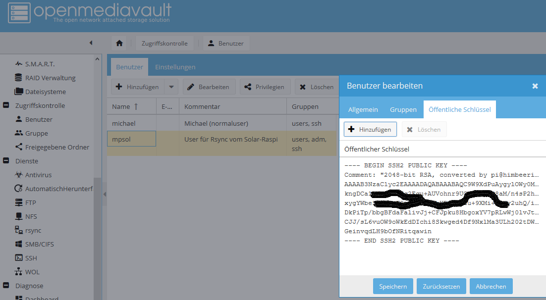 .... jetzt den SSH-Key markieren und per cut&paste beim user „mpsol“ auf der OMV-NAS eintragen und speichern.
