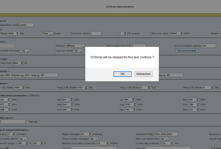 Durch den Kommunikationstest wird 123solar gestoppt und muss danach wieder gestartet werden!