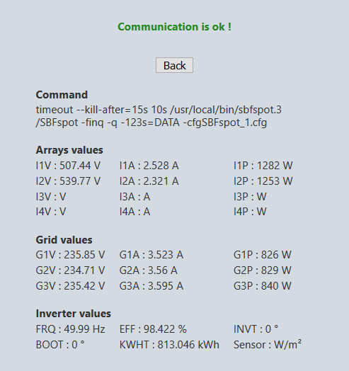 Beim Kommunikationstest wird sbfspot mit der Option "-cfgSBFspot_0.cfg" aufgerufen (/usr/local/bin/sbfspot.3/SBFspot -finq -q -123s=DATA -cfgSBFspot_0.cfg). Deshalb muss die Konfigurationsdatei SBFspot.cfg vor dem Test als SBFspot_0.cfg kopiert werden.