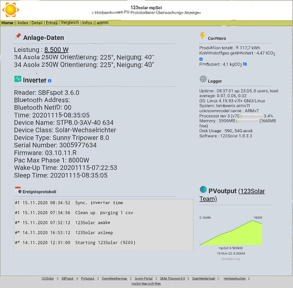 Sobald 123Solar aktiviert ist werden die aktuellen Daten (seit Aktivierung 123solar) aus der SBFspot-DB gelesen und im Ordner /etc/www/123solar\data\invt1\ als csv-Datei abgelegt und entsprechend visualisiert. Werte die vor dem Zeitpunkt der Aktivierung liegen werden nicht berücksichtigt. Um diese „historischen“ Daten ebenfalls in 123solar zu sehen müssen die entsprechenden CSV-Dateien manuell bzw. mit Script erzeugt werden. Mit dem Script 123repair.sh das sich im Ordner /home/pi/scripts/befindet, werden die fehlenden Spot-Daten aus SBFspot.db ausgelesen und als csv-Datei unter /home/pi/tmp gespeichert und nach Überprüfung in den Ordner /etc/www/123solar\data\invt1 kopiert werden. Ggf. muss noch der Owner der Dateien angepasste werden. (sudo –R chown www-data:www-data 123solar).